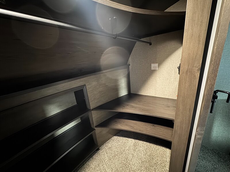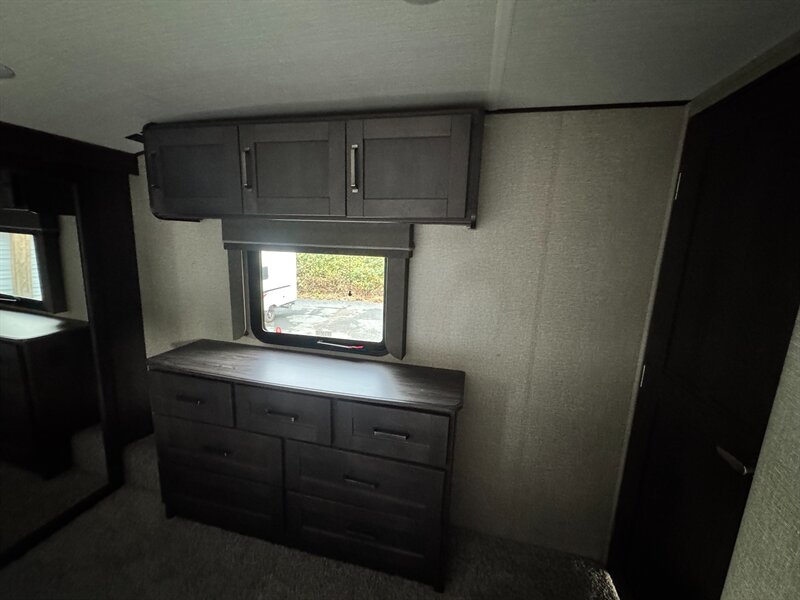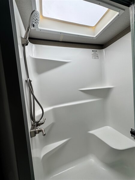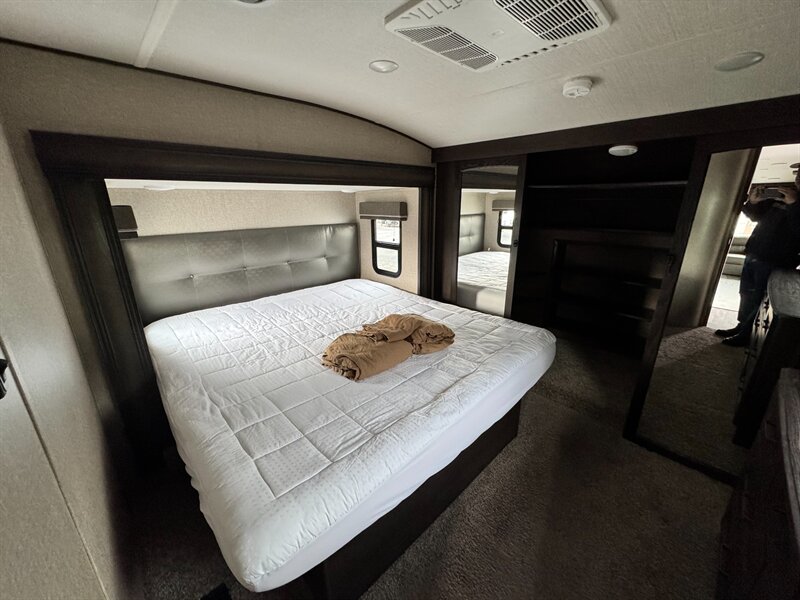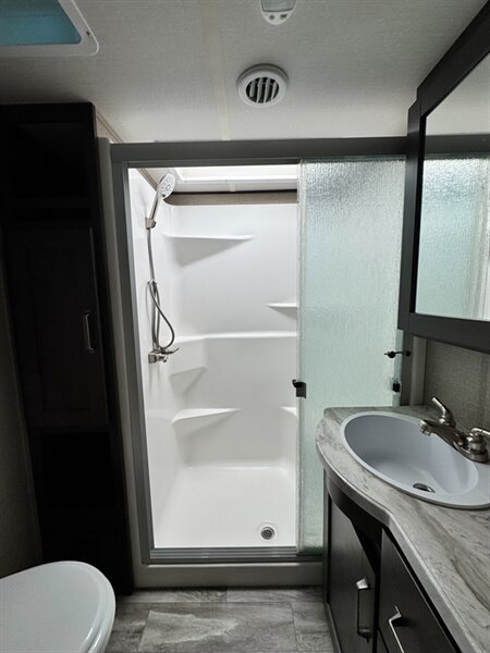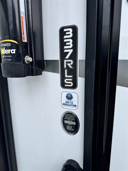 The 377RLS model features a comfortable master bedroom with a king-sized bed, ensuring a restful night’s sleep after a day of adventure. The adjoining bathroom is equipped with a spacious shower, a porcelain toilet, and a sink with plenty of counter space, providing all the amenities you need for a refreshing routine.