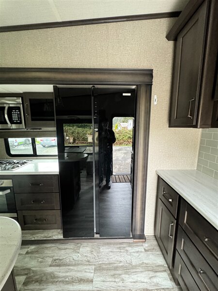 Step inside, and you’ll be welcomed by a stylish gray interior that exudes modern elegance. The spacious living area is thoughtfully designed to provide ample room for relaxation and entertainment. With plush seating and large windows, you can enjoy the beauty of the outdoors while staying cozy inside. The well-appointed kitchen boasts high-quality appliances, including a refrigerator, three-burner cooktop, and microwave, making meal prep a breeze. The generous countertop space and ample cabinetry offer plenty of storage for all your essentials.