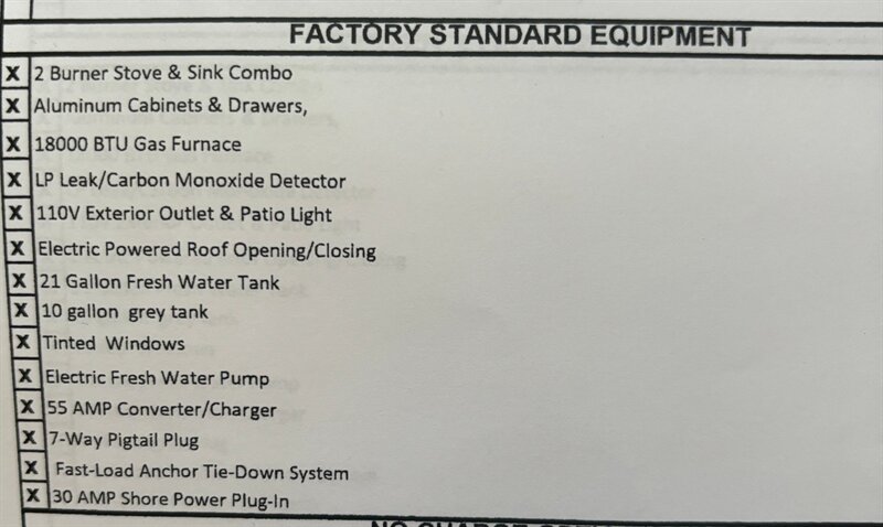 Includes Factory Standard Equipment (Picture included) AGM 12 Volt Deep Cycle Battery 1.7 CU FT Build In Refrigerator 1.0 CU FT Microwave Fold Up Glow Step Entry Stairs and Glo Guide Hand Rail 5 Gallon Propane Tank Black Upholstery ( Interior) Black Cabinets Symphony (white, light gray) Counter Top Toilet & Toilet Cabinet Power Jacks w/Remote & Removable Jack /system