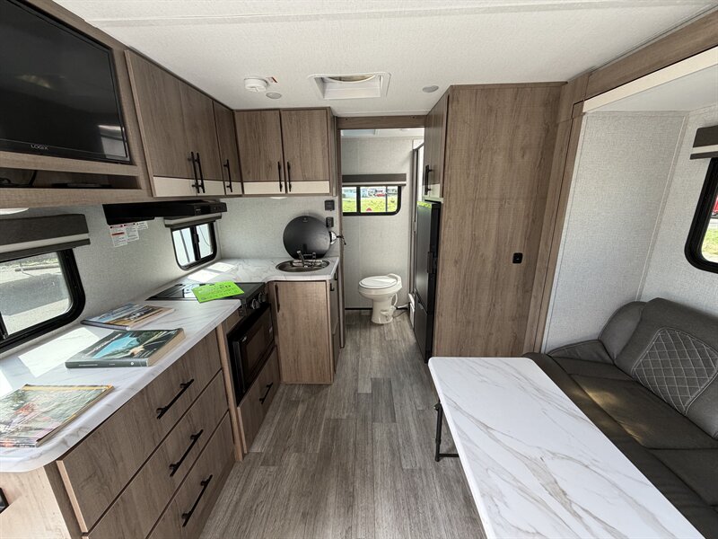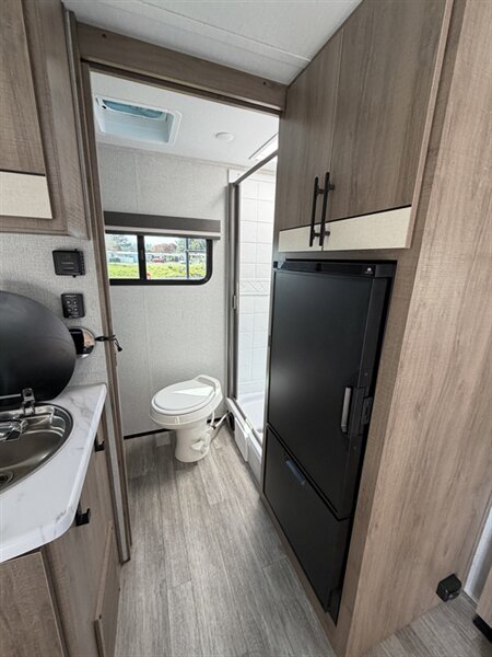 Kitchen - Compact galley with stainless or composite sink, countertop workspace, and upper/lower cabinetry. - 3-burner range or cooktop with oven or range top and a microwave or convection microwave above the counter (exact appliance layout varies by model). - 12V refrigerator (absorption or compressor style depending on factory options) sized for the floorplan. - Pantry or food storage uses optimized to the trailer’s dimensions. DANNY