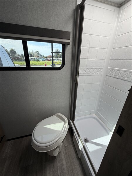 Exterior and construction - Laminated exterior sidewalls with a finished fiberglass or painted surface designed for a clean, low-maintenance look. - Aerodynamic front profile and exterior graphics package. - One-piece roof membrane (factory-installed) to resist leaks; sealed roof penetrations for long-term durability. - Enclosed underbelly and insulation package to improve thermal performance and protect tanks/lines. - Exterior utility connections: city water inlet, black/gray tank flush, and 30A/50A power inlet per model configuration. - Exterior storage compartments and accessible service points for tanks, hookups and batteries. - Entry steps (folding or solid) and exterior grab handle for safer entry/egress.