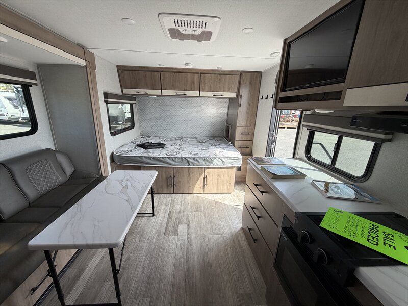 Interior living and finishes - Functional floorplan oriented to maximize living and sleeping space in a compact footprint. - Residential-style cabinetry with multiple storage compartments and wardrobe space. - LED interior lighting for low energy use and a brighter cabin atmosphere. - Vinyl or wood-look flooring that is durable and easy to clean. - Windows with privacy shades or night shades; roof vents and windows positioned for cross ventilation.