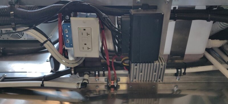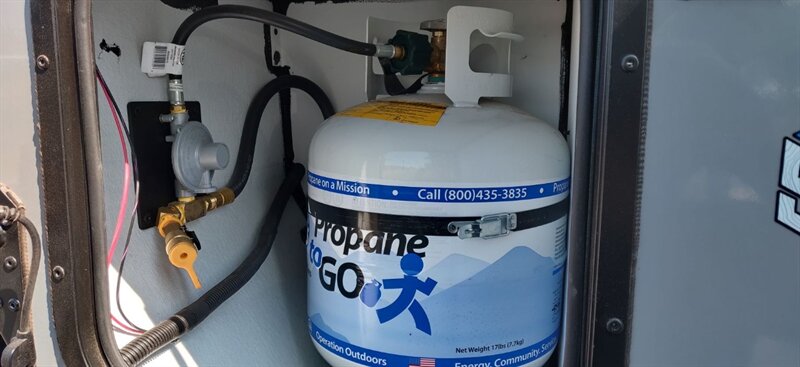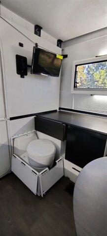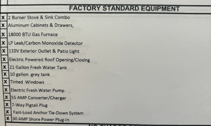 Includes Factory Standard Equipment (Picture Include) AGM 12 Volt Deep Cycle Battery 1.7 CU FT Built In Refrigerator 1.0 CU FT Build In Microwave Fold Up Glow Step Entry Stairs & Glo Guide Hand Rail 5 Gallon Propane Tank Black Upholstery (Interior) White Cabinets Licorice ( Black, dark grey) Counter Top 380 Watt (Qty 2) 190 Watt Solar Panels w/Solar Controller Toilet & Toilet Cabinet Plumb for BBQ Power Jacks w/Remote & Removable Jack System Max Air Deluxe Roof Vent