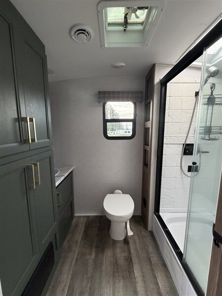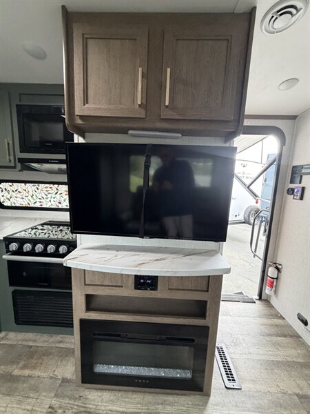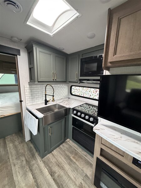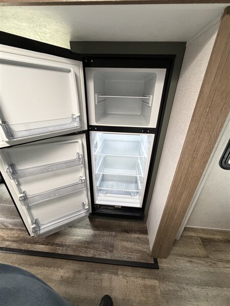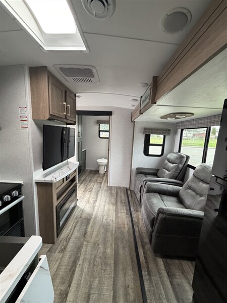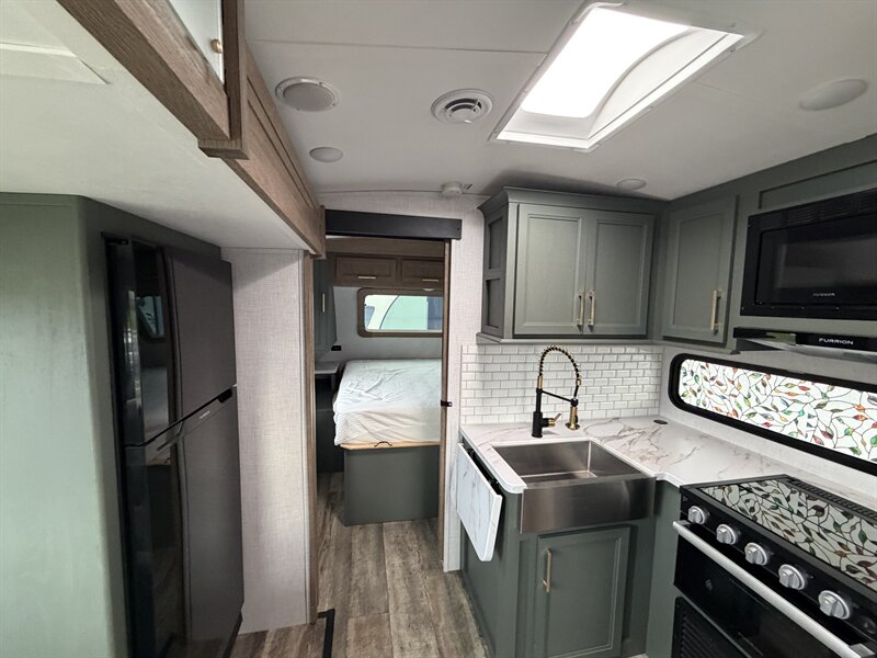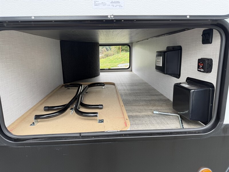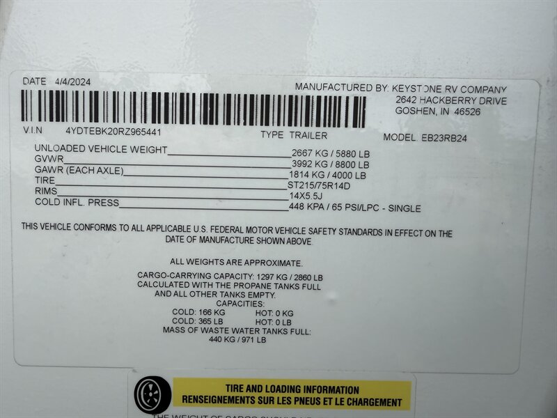 Meet the 2024 Keystone Eddie Bauer 23RB — a stylish, well-equipped travel trailer in excellent overall condition with a sleek black exterior and matching black interior. This Eddie Bauer edition blends durable construction with thoughtful comforts and upscale touches made for weekend getaways or longer road trips. Below is a detailed look at the factory-standard features you’ll find on this model. Overview - Classic Eddie Bauer styling and trim, factory-installed for a premium look and feel. - Black exterior finish for a bold, modern appearance; coordinated black interior finishes and upholstery for a cohesive, contemporary cabin feel. - Designed to maximize comfort and functionality in a compact, easy-to-tow package. Interior Comfort & Living Area - Comfortable seating arranged for lounging and socializing, finished in black upholstery that’s both attractive and easy to maintain. - LED interior lighting throughout for bright, efficient illumination and lower power draw. - Large windows with shades for natural light and privacy control. - Dinette that converts to additional sleeping space (typical of this floorplan) and provides a dining/workspace. - Entertainment provisions including stereo system with Bluetooth/AM-FM capability and a TV hookup/prep so you can add a flat-screen with ease. Kitchen - Well-equipped factory kitchen ready for meal prep on the road: three-burner cooktop and oven or cooktop with range (standard in this class), plus an over-the-range microwave for quick reheating and convenience. - Refrigerator sized for trailer living to keep perishables fresh. - Deep sink with practical faucet and generous counter space for prep; durable countertops designed to stand up to travel use. - Ample overhead and under-counter cabinetry for dishes, utensils and pantry items, finished to match the Eddie Bauer interior trim. - Convenient kitchen lighting and a range hood with exhaust and light to keep the space comfortable while cooking. Sleeping & Privacy - A comfortable main sleeping area with a roomy mattress and storage options (wardrobe closets, overhead cabinets, and under-bed/under-seat storage). - Privacy features such as a curtain or door to separate the bedroom area from the main living space depending on the exact factory layout. Bathroom - Rear bathroom layout (RB — rear bath) with a roomy shower or tub/shower combo, molded surround for easy cleaning, and a skylight or vent to bring in light and aid ventilation. - Vanity with sink and medicine cabinet for storage of toiletries. - Sturdy flush toilet and practical bathroom lighting and ventilation. Climate Control & Comfort Systems - Factory-installed roof-mounted air conditioning for cooling on warm nights. - Forced-air furnace for comfortable heating in cooler weather. - Roof vent(s) and powered vent fans for improved airflow and moisture control. Utilities & Electrical - 30-amp shore power hookup for campground electrical connections. - Onboard electrical converter/charger and battery compartment for mobile power needs. - Interior and exterior LED lighting to conserve energy. - Standard hookups and preps for cable/satellite and antenna. Plumbing & Water Systems - Pressurized fresh water system with a factory-installed water pump. - Hot water heater installed at the factory to provide on-demand hot water for showers and kitchen cleanup. - Black and gray water tanks with factory-installed plumbing and drain valves for easy campsite hookups and dumping. Exterior Features - Bold black exterior finish with durable siding and an aerodynamic front profile. - Power awning to create shade and outdoor living space quickly and easily; often comes with LED lighting integrated into the awning. - Large exterior storage compartments and pass-through storage (depending on exact floorplan) for camping gear and outdoor equipment. - Exterior speakers for outdoor entertainment, plus exterior hookup points for light and water where applicable. - Sturdy entry steps and secu