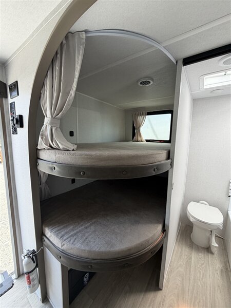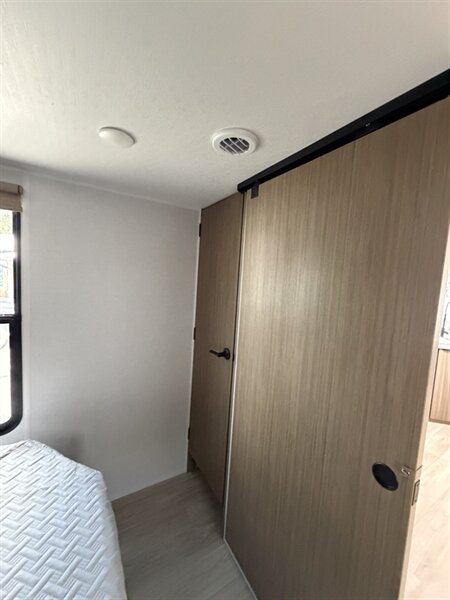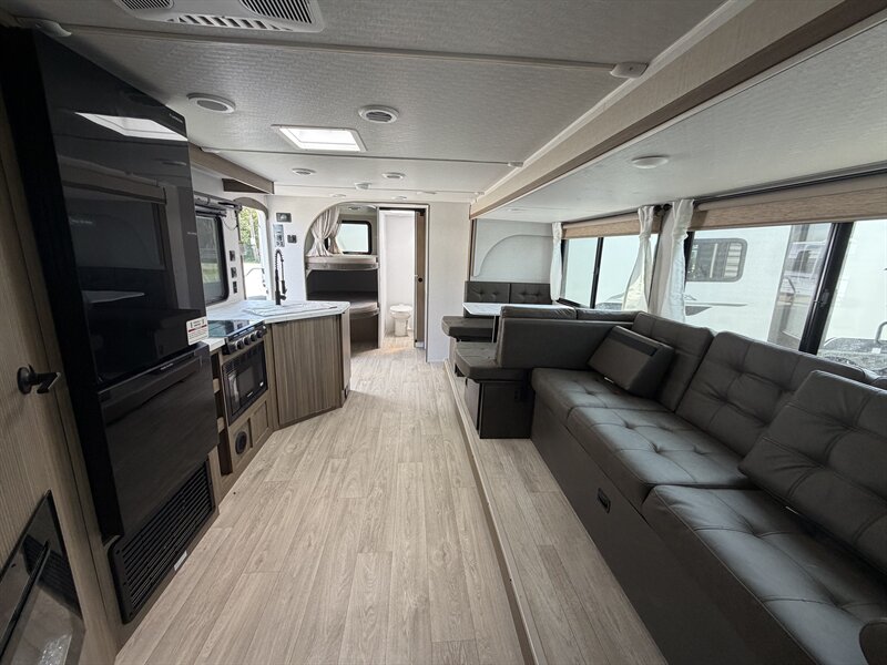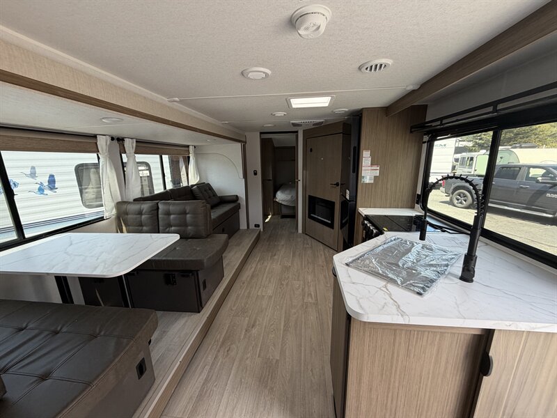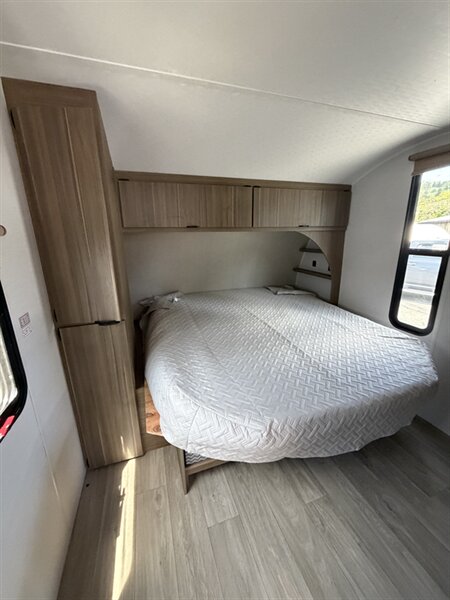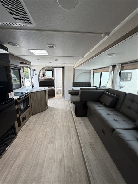 Interior comfort and layout - A bright, open living area with abundant windows for natural light and panoramic views. - Comfortable seating including a convertible dinette and sofa that provide flexible sleeping or lounging options. - A private master sleeping area with a roomy bed, storage, and privacy curtains/doors for restful nights. - Ample overhead cabinetry and wardrobe storage to keep clothing, linens, and personal items organized. - Soft, easy-to-clean flooring throughout the main living areas for practicality on the road.