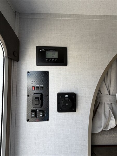 Bath and convenience - A full bathroom with a shower (with skylight or vent for added headroom and light), vanity, and storage for toiletries. - Efficient freshwater and waste systems with user-friendly plumbing and service access points. - Interior LED lighting and multiple USB/12V charging ports for phones and devices. - Climate comfort features to keep you cozy and cool — roof-mounted air conditioner and a reliable furnace provide year-round usability.